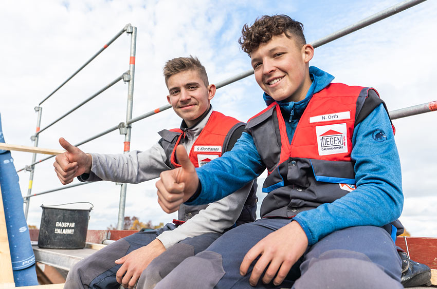 Wer Lust auf Nervenkitzel hat und beruflich hoch hinaus möchte, ist als Dachdecker-Azubi (m/w/d) bei Degen genau richtig! Wir begleiten junge Leute beim Einstieg ins Berufsleben, stehen ihnen mit Rat und Tat zur Seite und bieten eine vielseitige Ausbildung mit Zukunftsperspektive. Das können auch Nils Orth (19 Jahre, rechts im Bild) und Samuel Kirschhausen (18 Jahre, links im Bild) bestätigen, die bei uns bereits im dritten Lehrjahr sind. Wir sind mächtig stolz auf unsere vielversprechenden Auszubildenden, die aller Voraussicht nach im kommenden Jahr ihre Gesellenprüfung ablegen. Mehr möchten wir aber gar nicht verraten, sondern lassen lieber Nils und Samuel zu Wort kommen. Freut euch auf ein spannendes Interview!